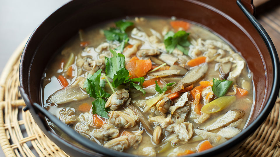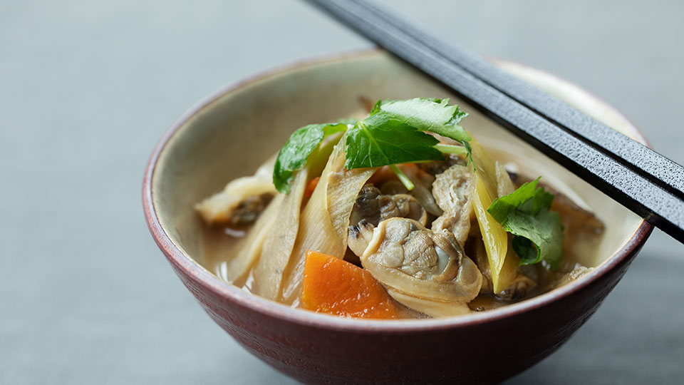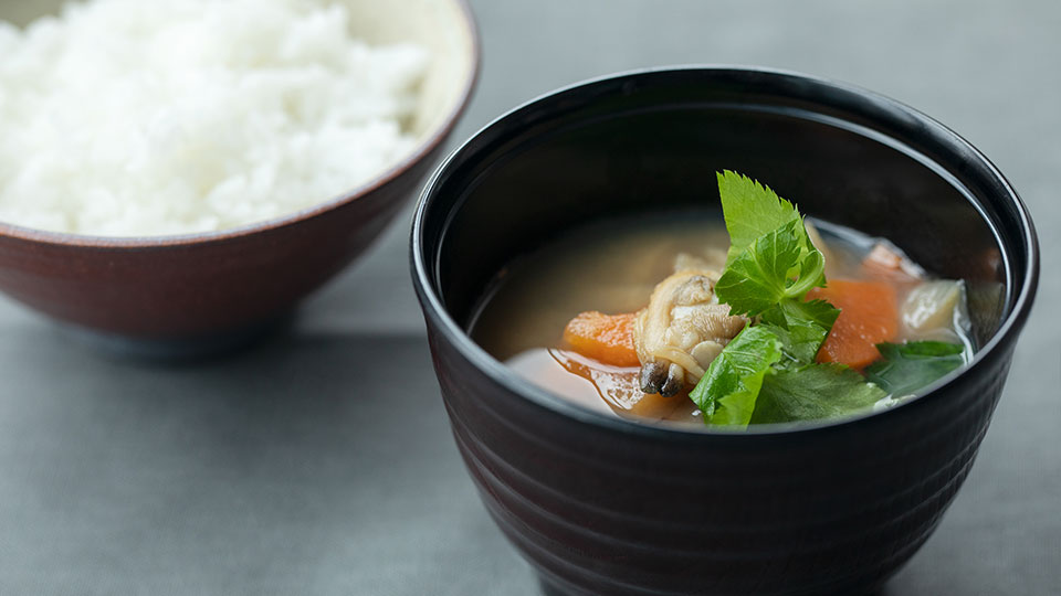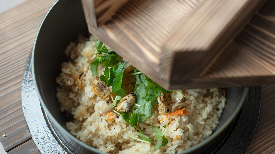 あさりと根菜、ネギを味噌で煮込んだ汁を炊きたての白米に“ぶっかけ”てお召し上がりいただく漁師飯。