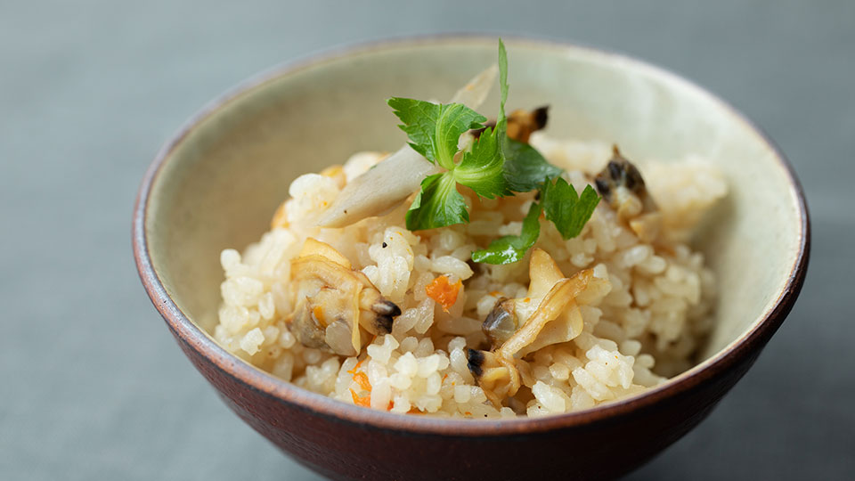 職人さんのお弁当用に作られた炊き込みごはん。あさりの旨味が染み込んだ、ふっくら炊きたてのおいしさです。