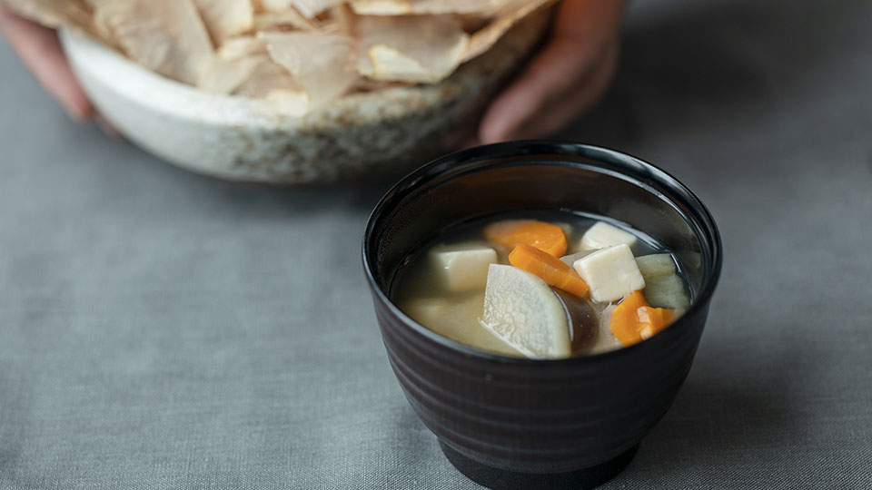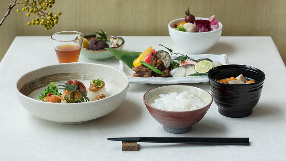 野菜たっぷりの味噌汁の出汁には、大正5年、日本橋で開業した老舗・築地秋山商店の削りたて鰹節を使用。血合いを取り除いた上質な鰹節の旨味、削りたての香りが朝のからだにやさしく染みわたります。