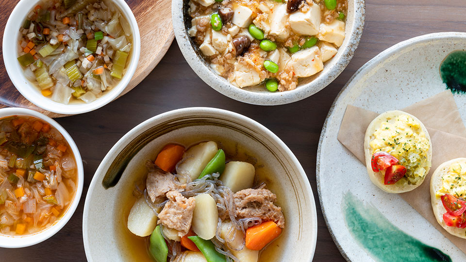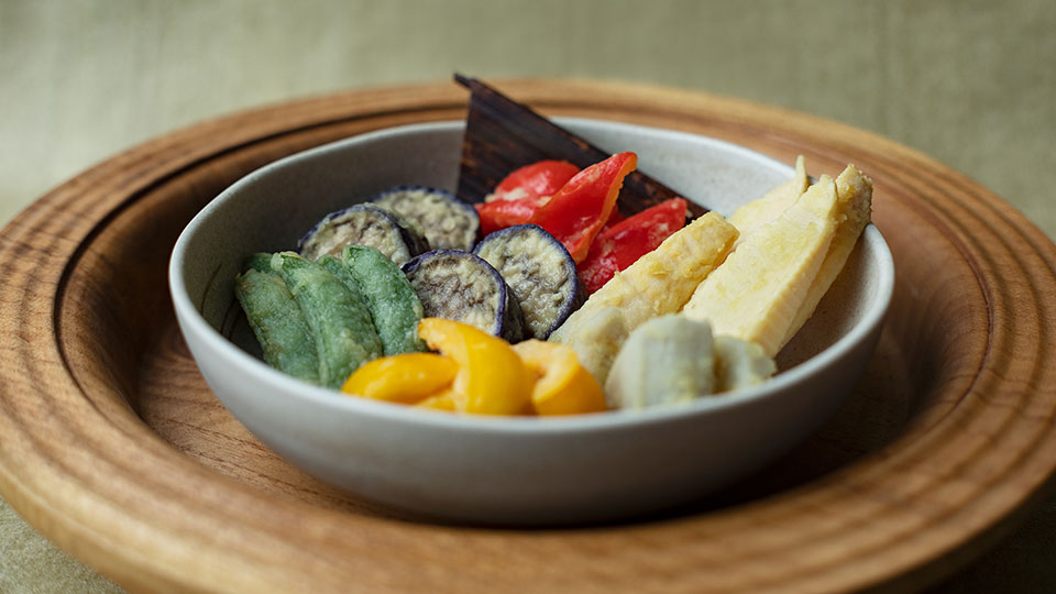 季節の野菜をたっぷりとグルテンフリーの大豆粉を衣に、サクッと揚げた彩り野菜の大豆粉揚げや江戸東京野菜のしんとり菜を使用した絹厚揚げの煮しめなど日替わりでご提供。