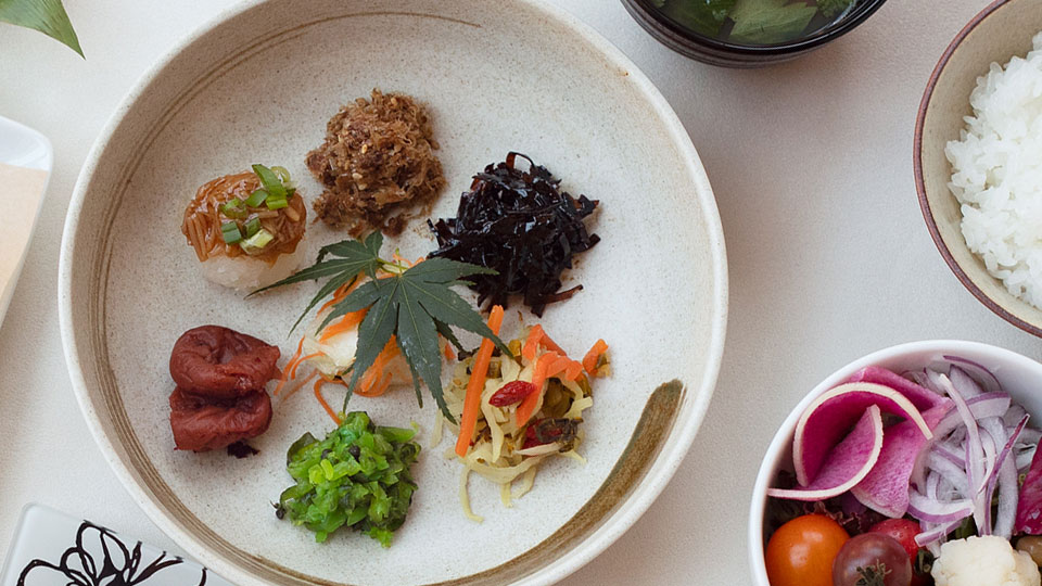 築地秋山商店のおかかや自家製浅漬け、ふりかけやなめたけ、梅干しなど、ごはんがすすむ一品が並びます。