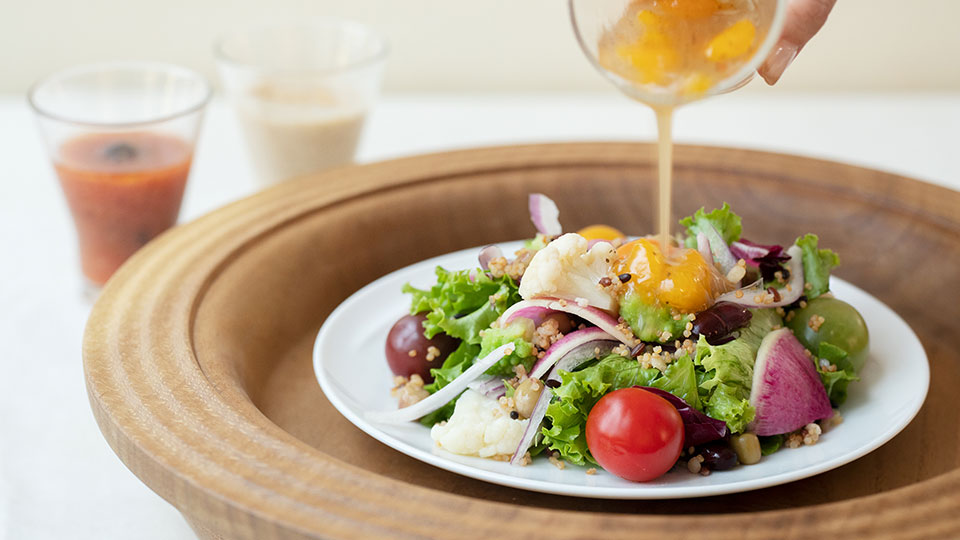 新鮮な国産野菜を季節ごとにラインナップ。野菜やフルーツをたっぷり使用したオリジナルの「食べるドレッシング」をかけてお召し上がりください。